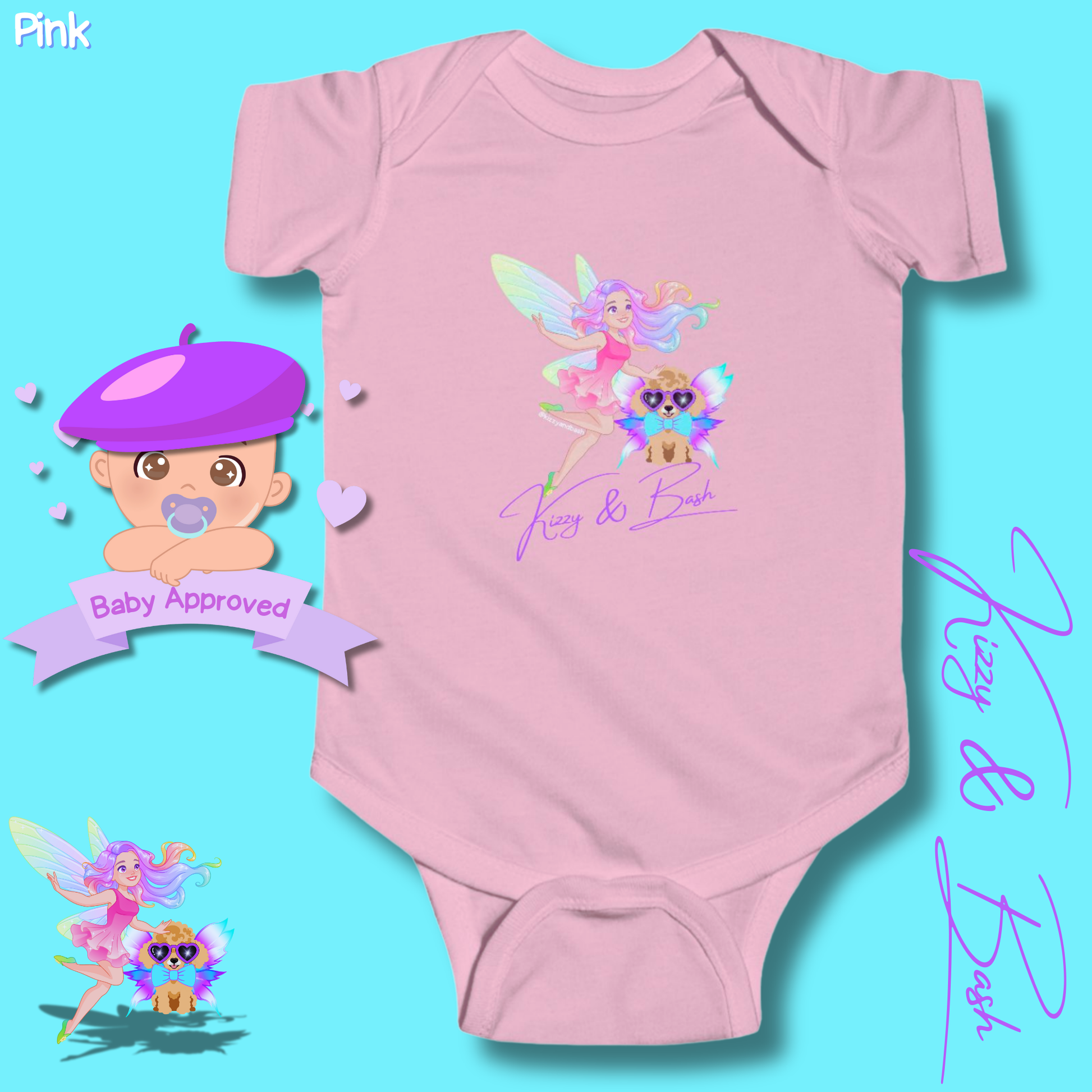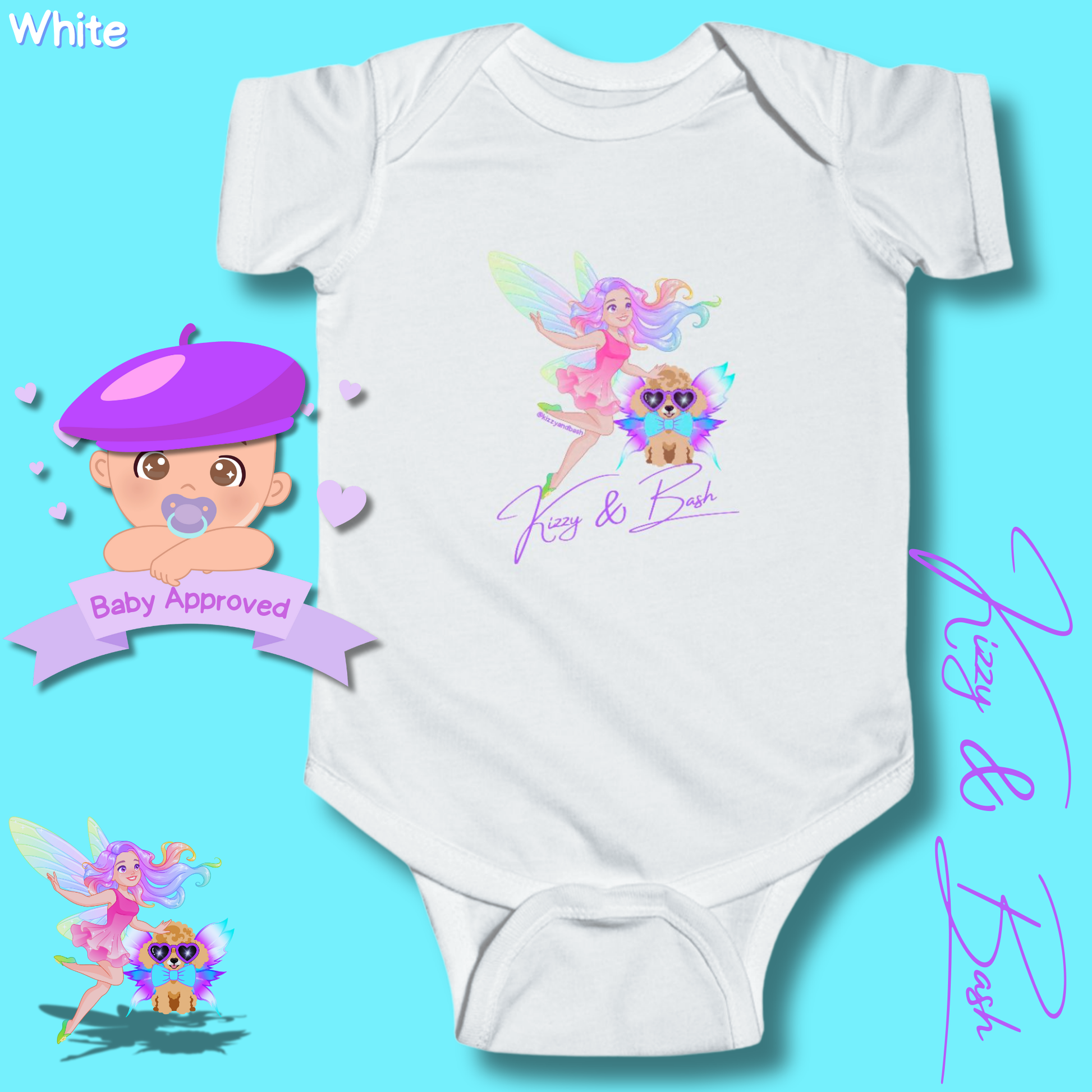 Two sprites take flight in this Kizzy & Bash one-of-a-kind super-soft fairy-and-her-toy-poodle-fairy infant fine jersey bodysuit/onesie design!