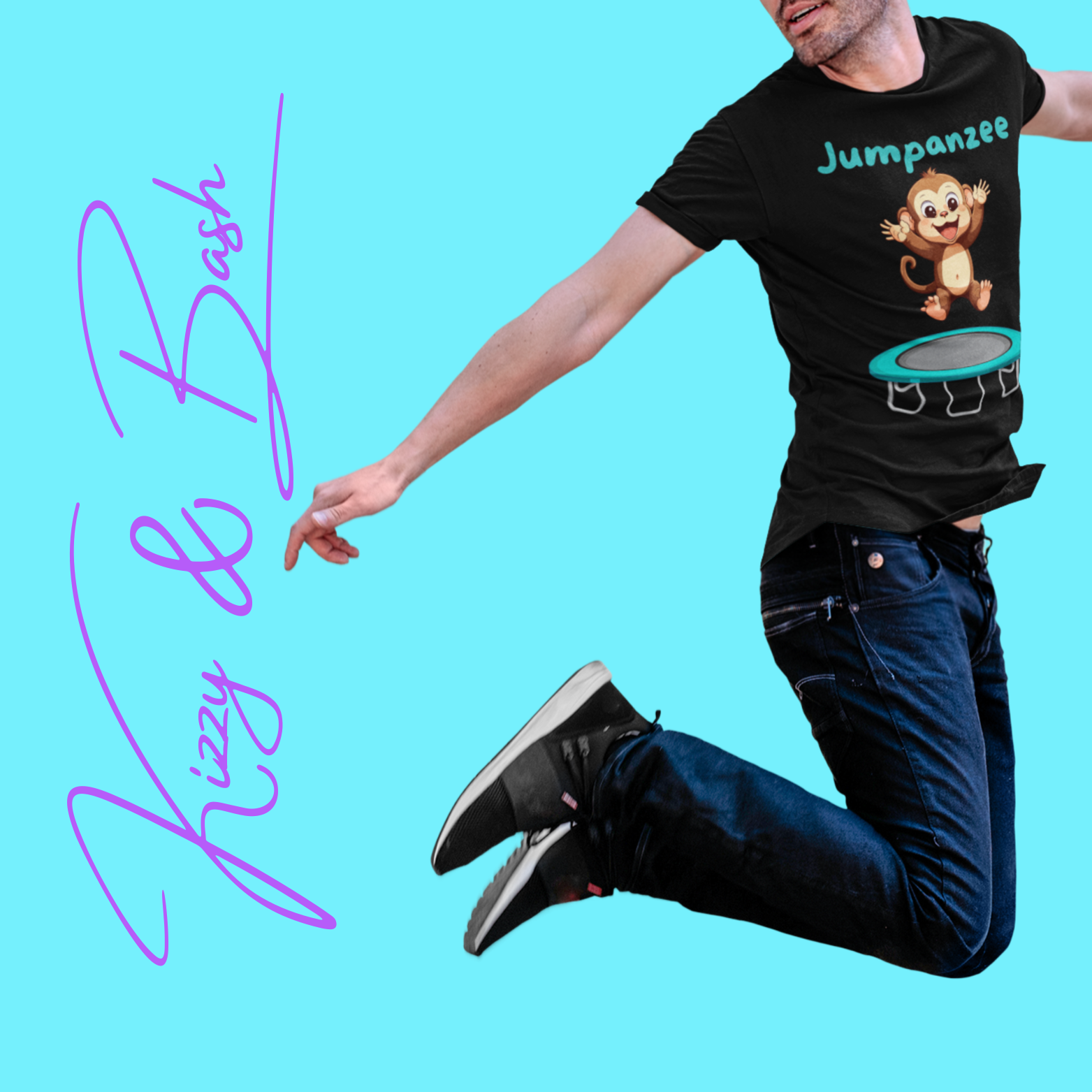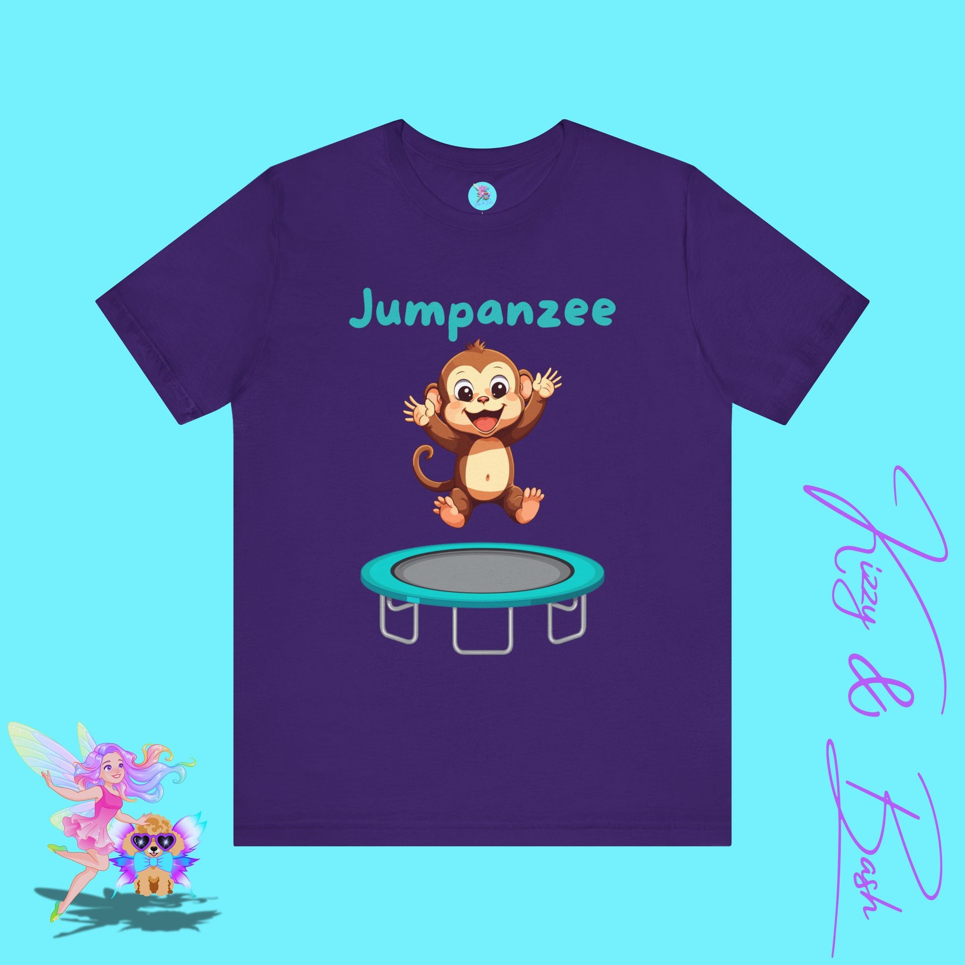 Jumpanzee T-Shirt Funny Monkey Jumping on Trampoline Graphic Tee Cute Animal Pun T-Shirt Fun Gift for Trampoline or Zoo Lovers Silly Monkey Shirt Monkey Lover Gift Adult Unisex Jersey Short Sleeve Tee