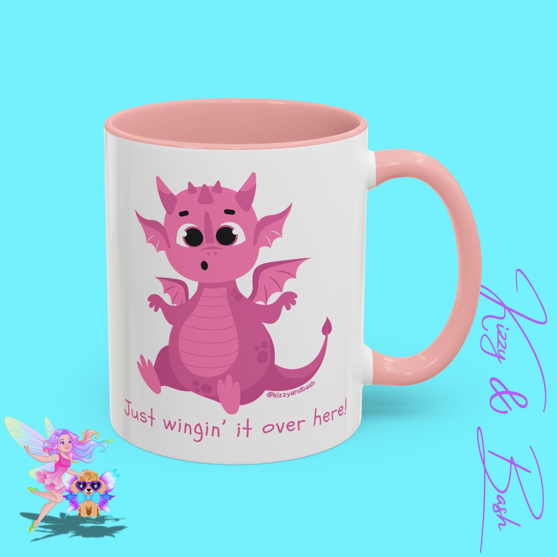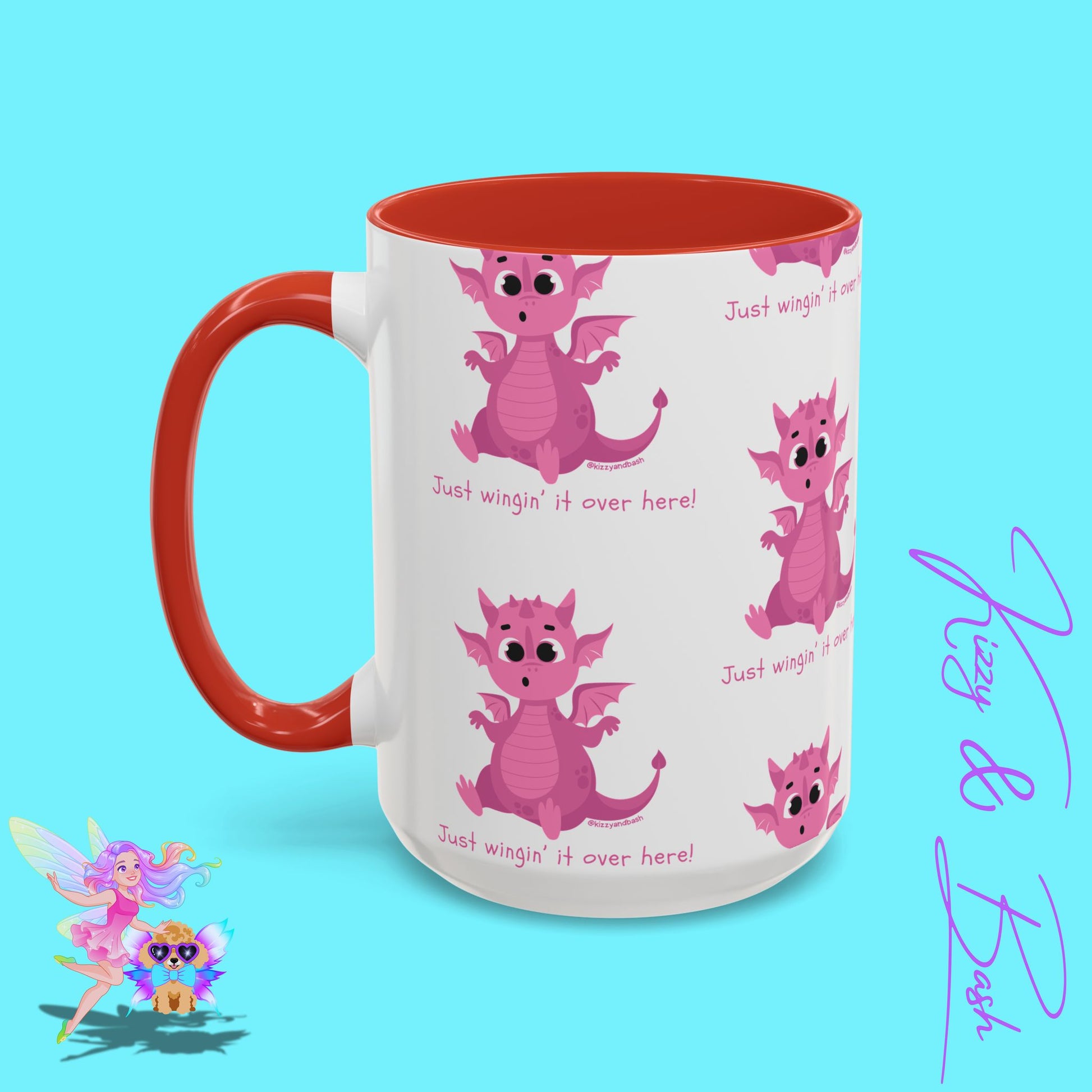 Pink Dragon Coffee Mug for Her Funny Dragon Mug Unique Dragon Gift for Her Just Wingin' It Over Here Self-Affirming Gift Idea Dragon Lover Mug Pink Lover Accent Coffee Mug 11, 15oz