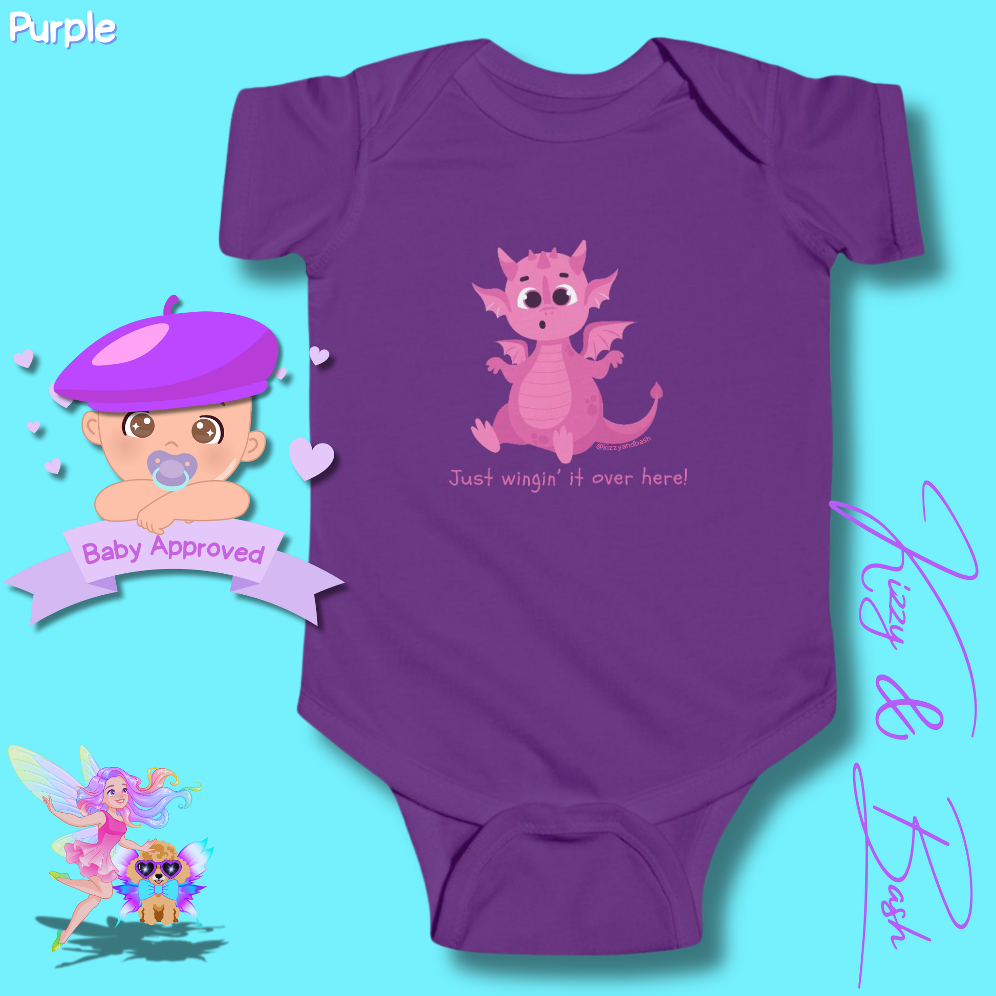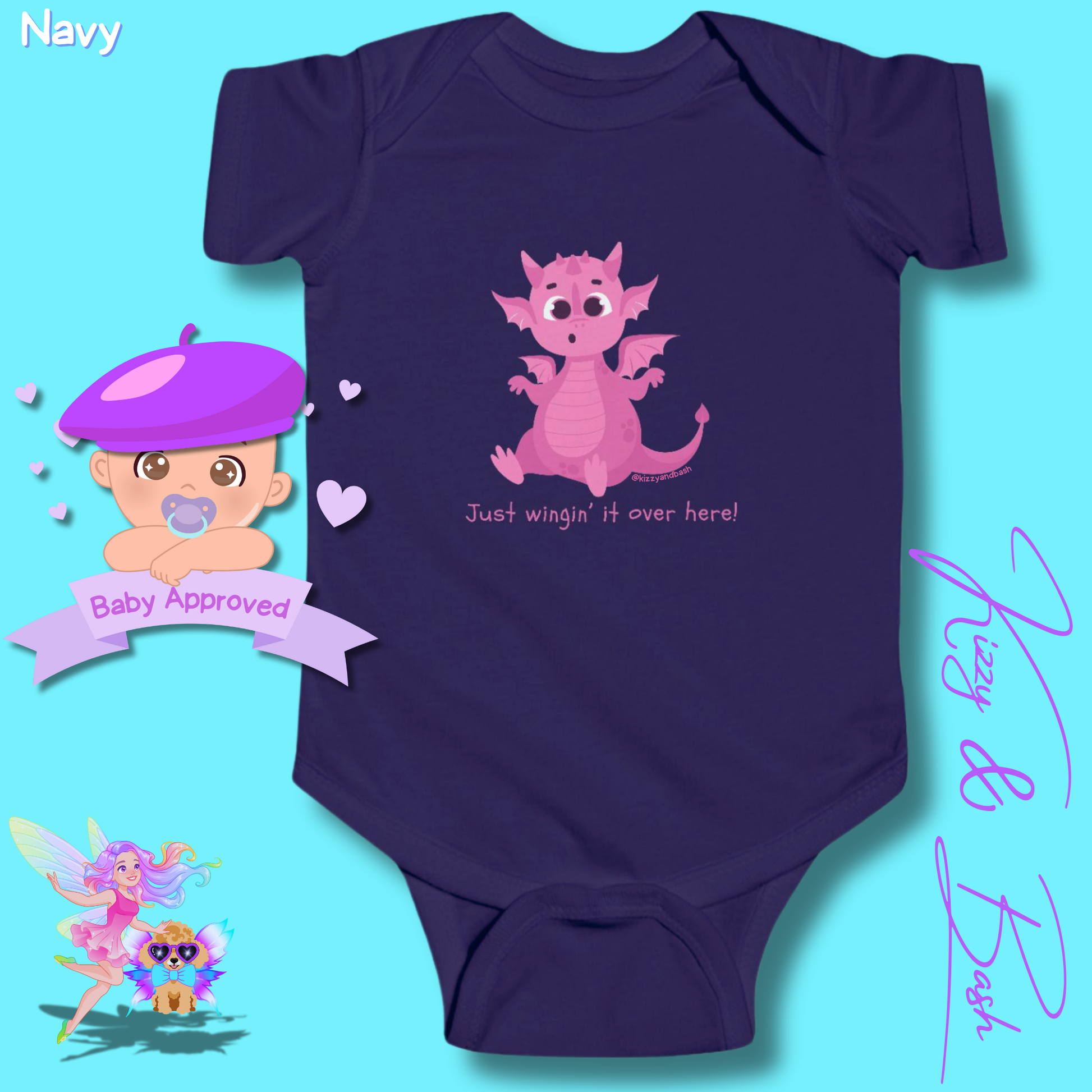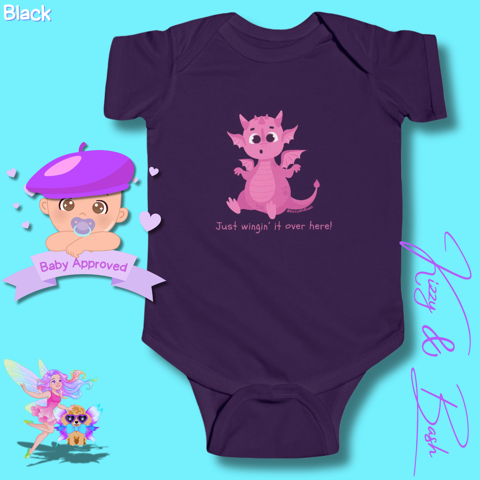 This determined little pink dragon isn't going to let inexperience — or tiny wings — keep her from succeeding today! She is brought to you by digital artist and children's book author and illustrator, Kizzy MacKenzie (@bizzybizzykizzy), via the dopamine-inducing-intoxicatingly-enchanting brand, Kizzy & Bash (@kizzyandbash). Kizzy co-founded Kizzy & Bash with her toy poodle sidekick (and muse), Bash, in 2025. (That's him in our logo)!